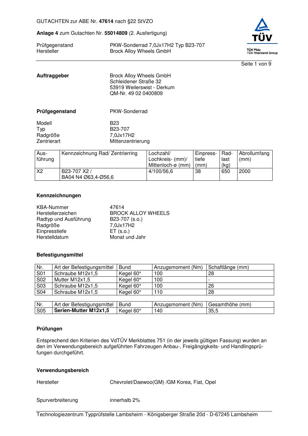 Dieses Gutachten (abe) bezieht sich auf die Alufelge Brock B23-707 in der Ausführung 7Jx17 ET 0, Mittenloch 0 mm (KBA 47614). Im PDF findest du typischerweise zulässige Reifengrößen, Auflagen/Anbauhinweise und – je nach Dokument – Hinweise zur Eintragung.