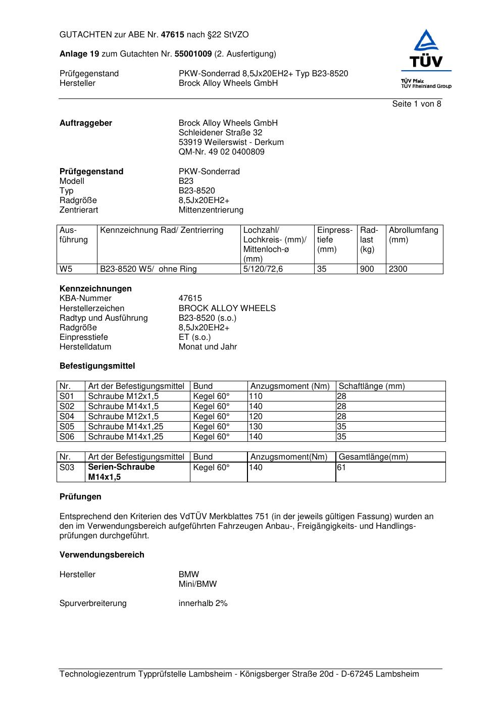 Dieses Gutachten (abe) bezieht sich auf die Alufelge Brock B23-85 20 in der Ausführung ET 0, Mittenloch 0 mm (KBA 47615). Im PDF findest du typischerweise zulässige Reifengrößen, Auflagen/Anbauhinweise und – je nach Dokument – Hinweise zur Eintragung.