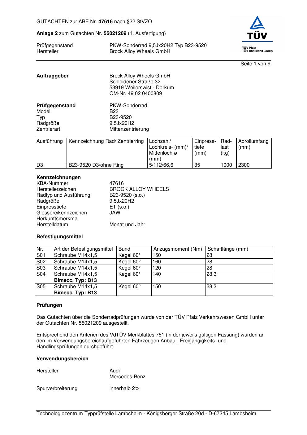 Dieses Gutachten (abe) bezieht sich auf die Alufelge Brock B23-9520 in der Ausführung 9.5Jx2 ET 0, Mittenloch 0 mm (KBA 47616). Im PDF findest du typischerweise zulässige Reifengrößen, Auflagen/Anbauhinweise und – je nach Dokument – Hinweise zur Eintragung.