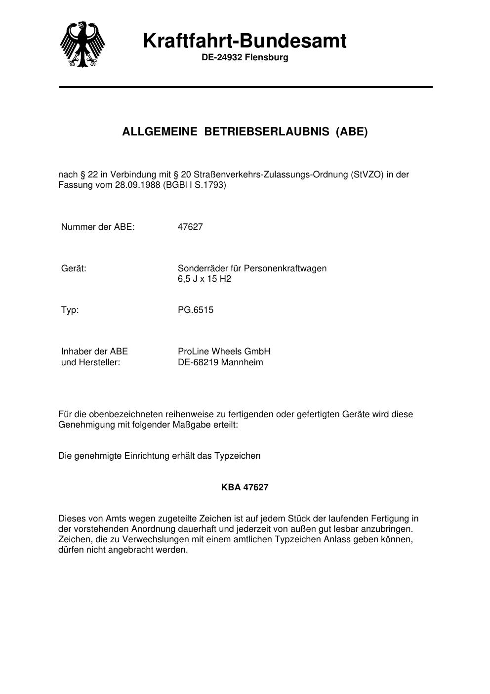 Dieses Gutachten (abe) bezieht sich auf die Alufelge Proline PG.6515 in der Ausführung 6.5Jx15 ET 0, Mittenloch 0 mm (KBA 47627). Im PDF findest du typischerweise zulässige Reifengrößen, Auflagen/Anbauhinweise und – je nach Dokument – Hinweise zur Eintragung.