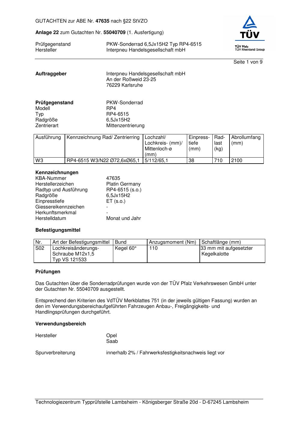 Dieses abe gehört zur Felge Platin RP4-6515 in 6.5Jx15 ET0 mit KBA 47635. Die Seite ist dafür gedacht, dass du schnell prüfen kannst, ob KBA, Design und Größe zu deiner Felge passen und danach direkt das richtige PDF lädst.