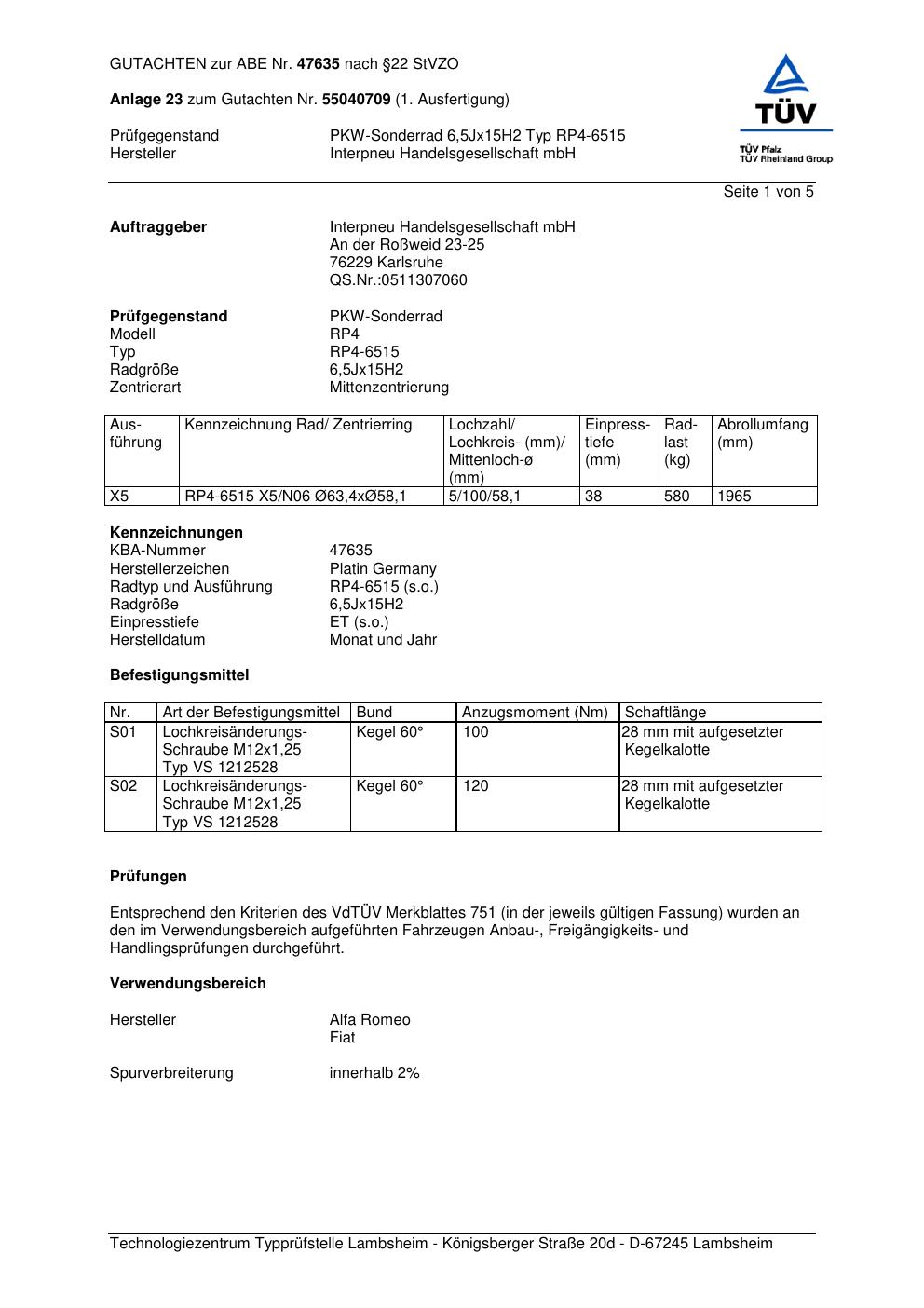 Dieses abe gehört zur Felge Platin RP4-6515 in 6.5Jx15 ET0 mit KBA 47635. Die Seite ist dafür gedacht, dass du schnell prüfen kannst, ob KBA, Design und Größe zu deiner Felge passen und danach direkt das richtige PDF lädst.