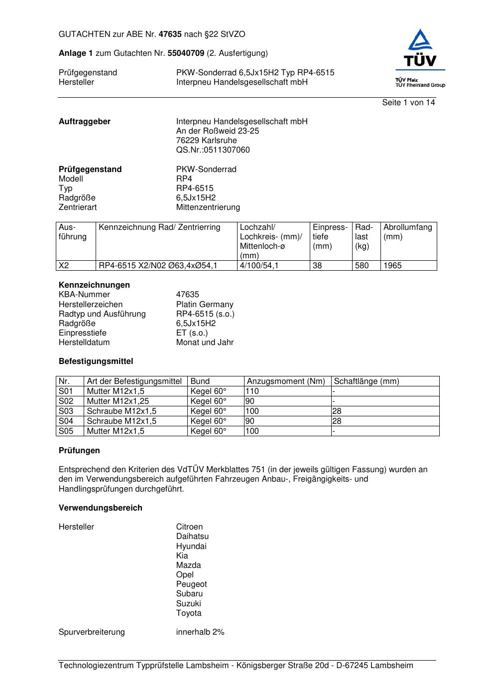 Dieses abe gehört zur Felge Platin RP4-6515 in 6.5Jx15 ET0 mit KBA 47635. Die Seite ist dafür gedacht, dass du schnell prüfen kannst, ob KBA, Design und Größe zu deiner Felge passen und danach direkt das richtige PDF lädst.