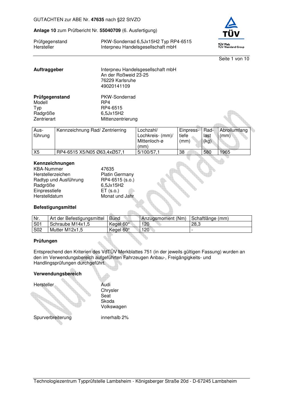 Dieses abe gehört zur Felge Platin RP4-6515 in 6.5Jx15 ET0 mit KBA 47635. Die Seite ist dafür gedacht, dass du schnell prüfen kannst, ob KBA, Design und Größe zu deiner Felge passen und danach direkt das richtige PDF lädst.