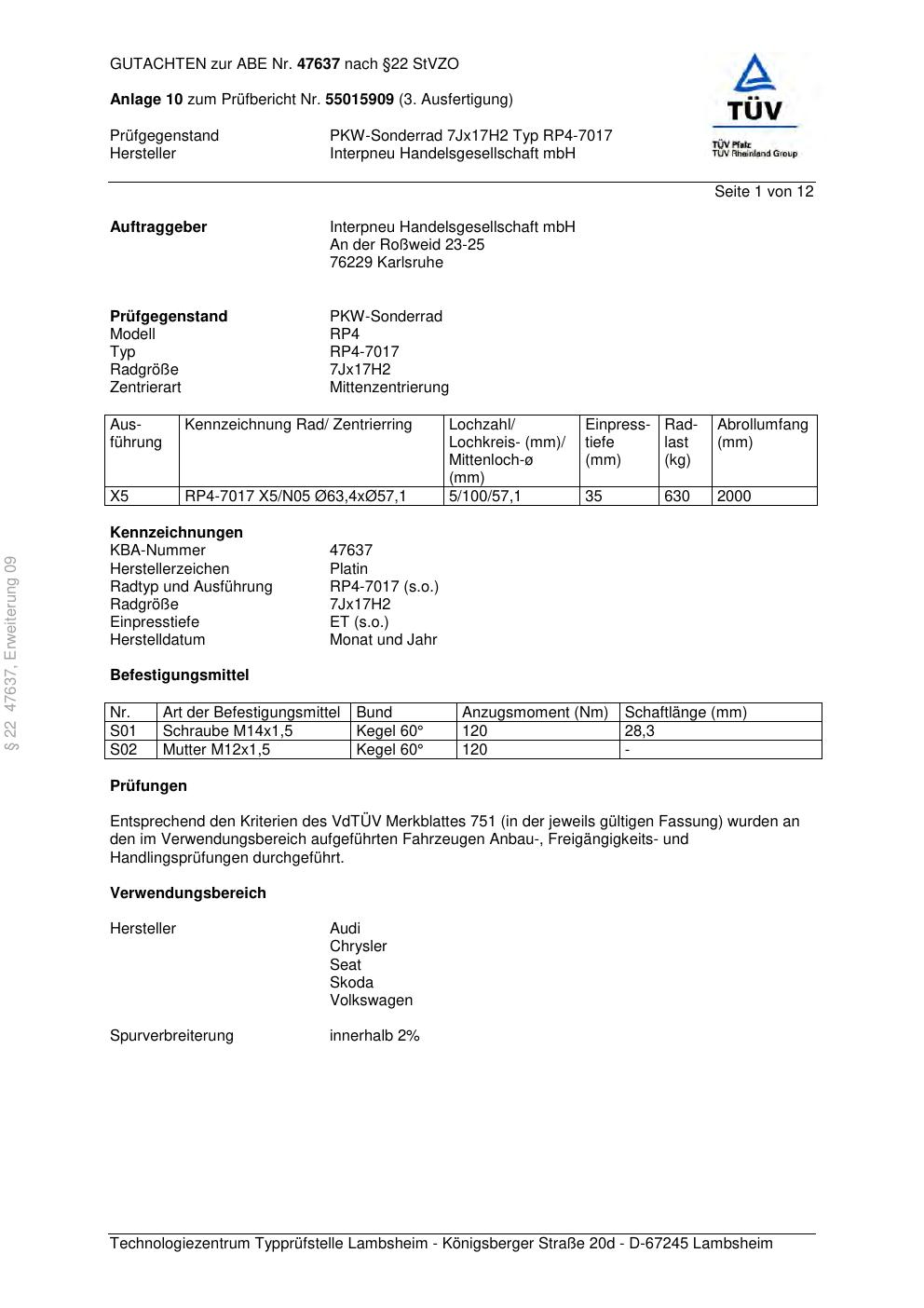 • Stimmt die KBA-Nummer auf der Felge mit diesem Dokument überein?