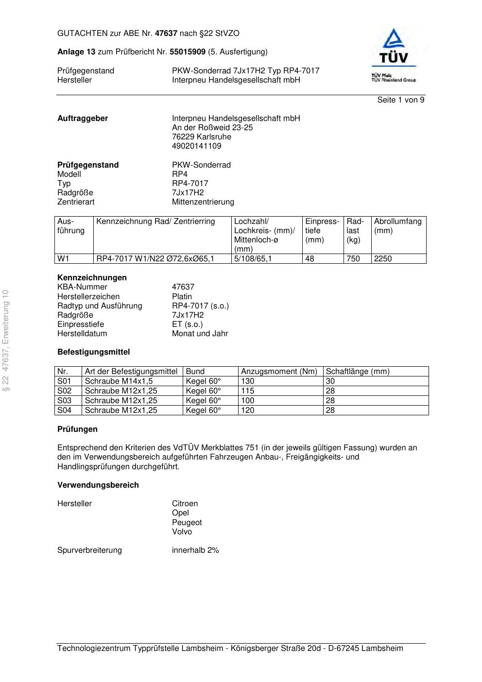 • Stimmt die KBA-Nummer auf der Felge mit diesem Dokument überein?