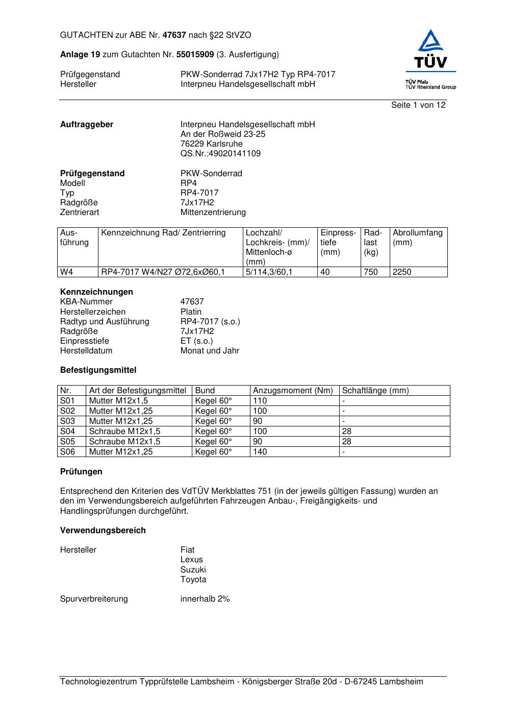 • Stimmt die KBA-Nummer auf der Felge mit diesem Dokument überein?