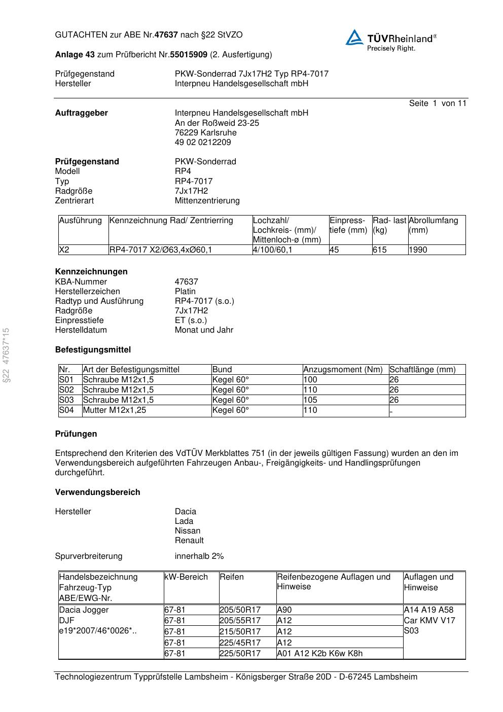 - Stimmt die KBA-Nummer auf der Felge mit diesem Dokument überein?