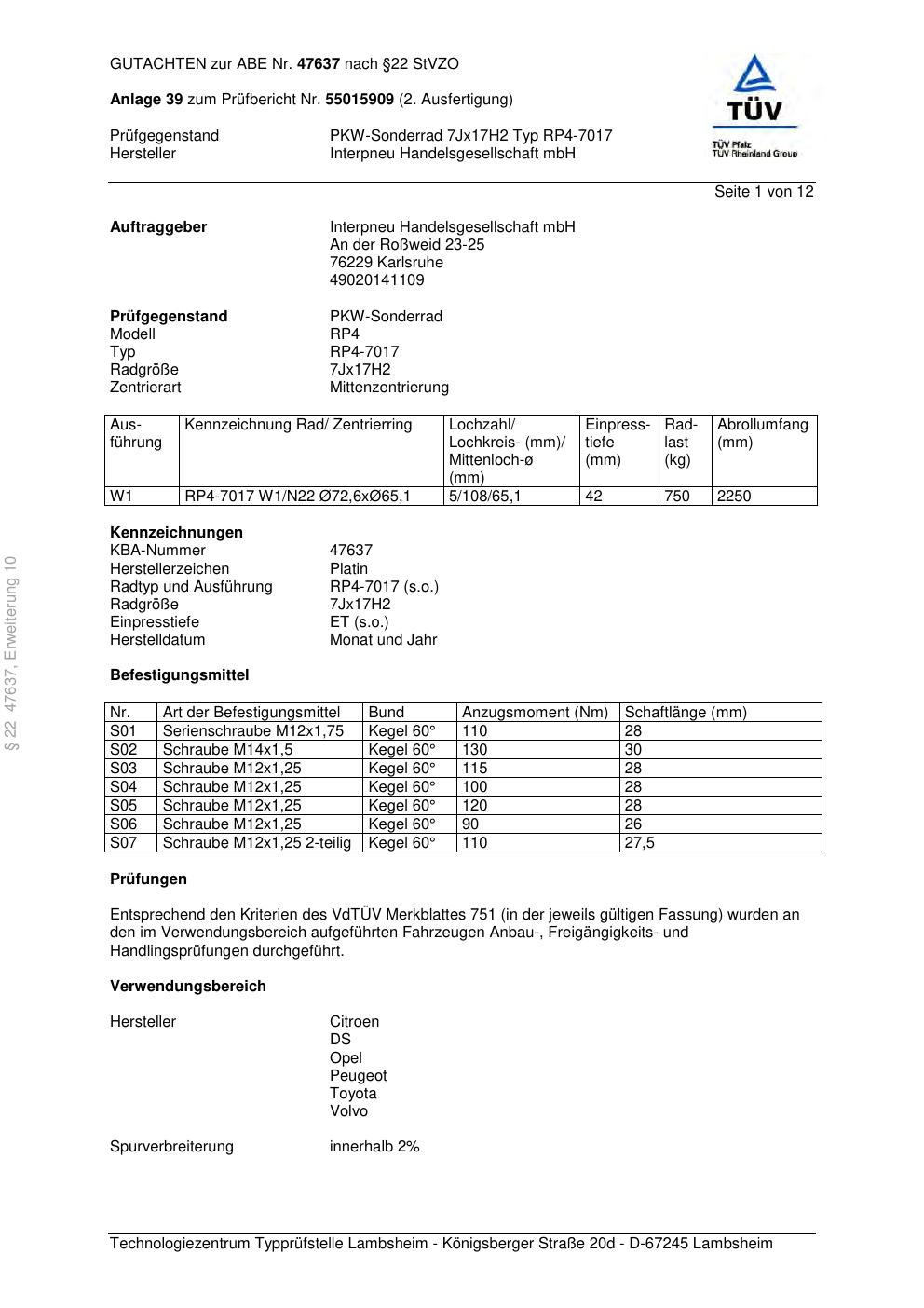 • Stimmt die KBA-Nummer auf der Felge mit diesem Dokument überein?