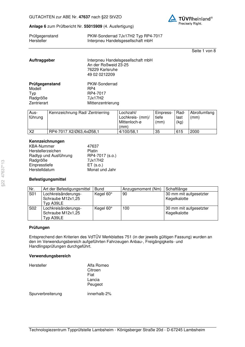 • Stimmt die KBA-Nummer auf der Felge mit diesem Dokument überein?