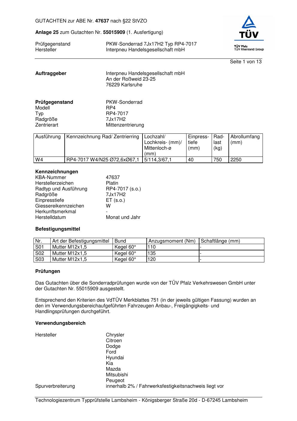 • Stimmt die KBA-Nummer auf der Felge mit diesem Dokument überein?