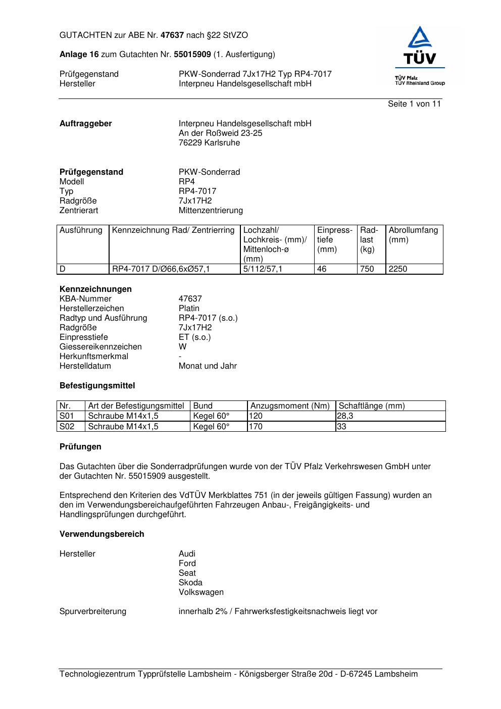 Dieses abe gehört zur Felge Platin RP4-7017 in 7Jx17 ET0 mit KBA 47637. Die Seite ist dafür gedacht, dass du schnell prüfen kannst, ob KBA, Design und Größe zu deiner Felge passen und danach direkt das richtige PDF lädst.