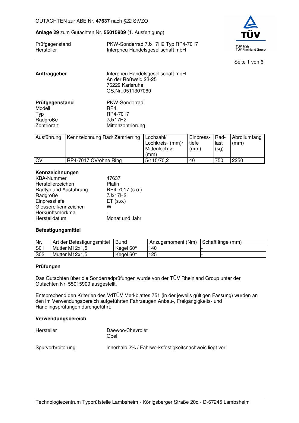 • Stimmt die KBA-Nummer auf der Felge mit diesem Dokument überein?