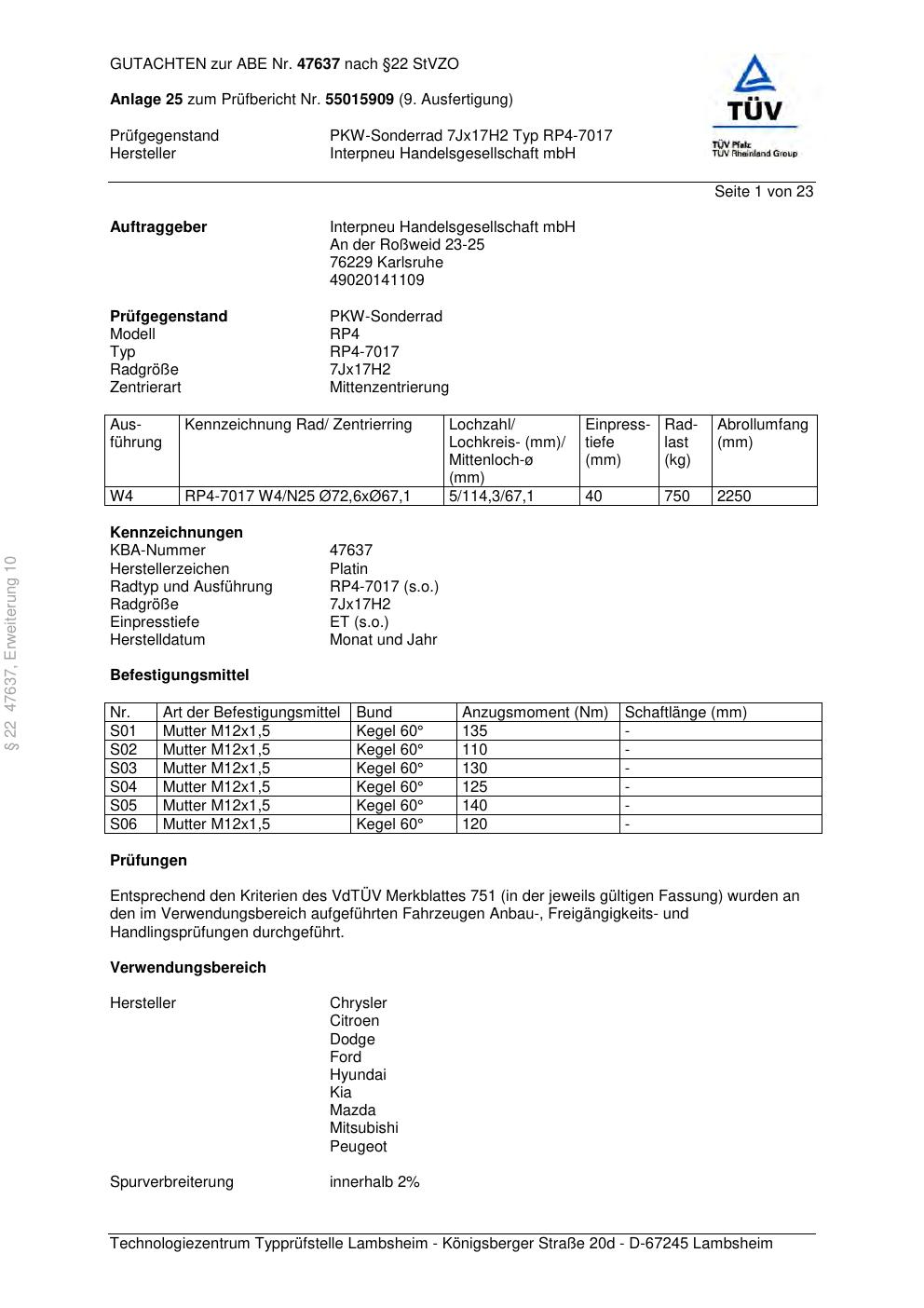 • Stimmt die KBA-Nummer auf der Felge mit diesem Dokument überein?