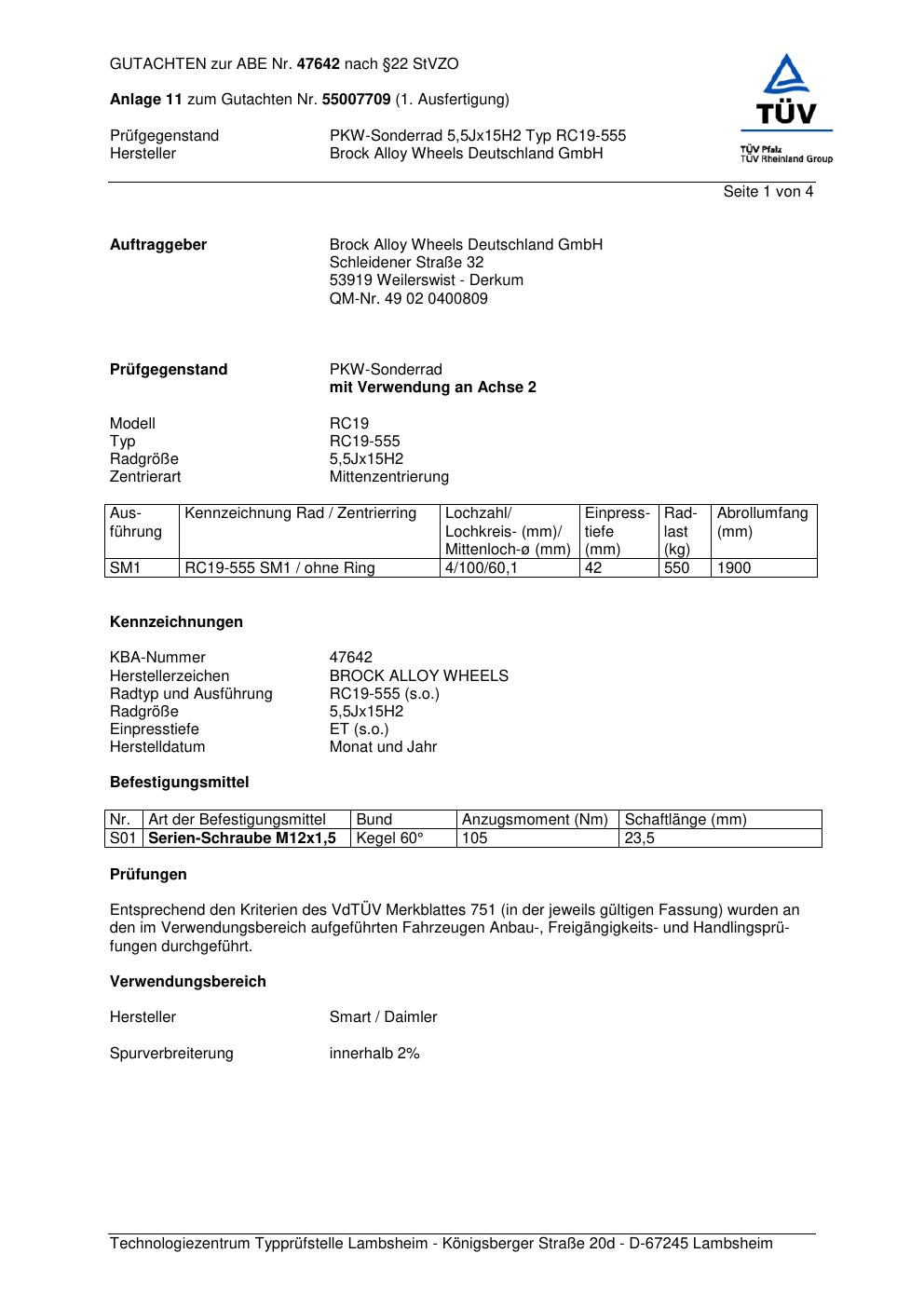 Dieses Gutachten (abe) bezieht sich auf die Alufelge Brock RC19-555 in der Ausführung 5.5Jx15 ET 0, Mittenloch 0 mm (KBA 47642). Im PDF findest du typischerweise zulässige Reifengrößen, Auflagen/Anbauhinweise und – je nach Dokument – Hinweise zur Eintragung.