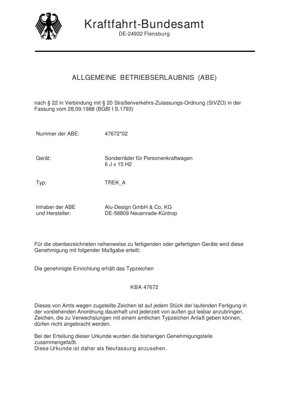 Dieses Gutachten (abe) bezieht sich auf die Alufelge brand-aez TREK_A in der Ausführung 6Jx15 ET 0, Mittenloch 0 mm (KBA 47672). Im PDF findest du typischerweise zulässige Reifengrößen, Auflagen/Anbauhinweise und – je nach Dokument – Hinweise zur Eintragung.