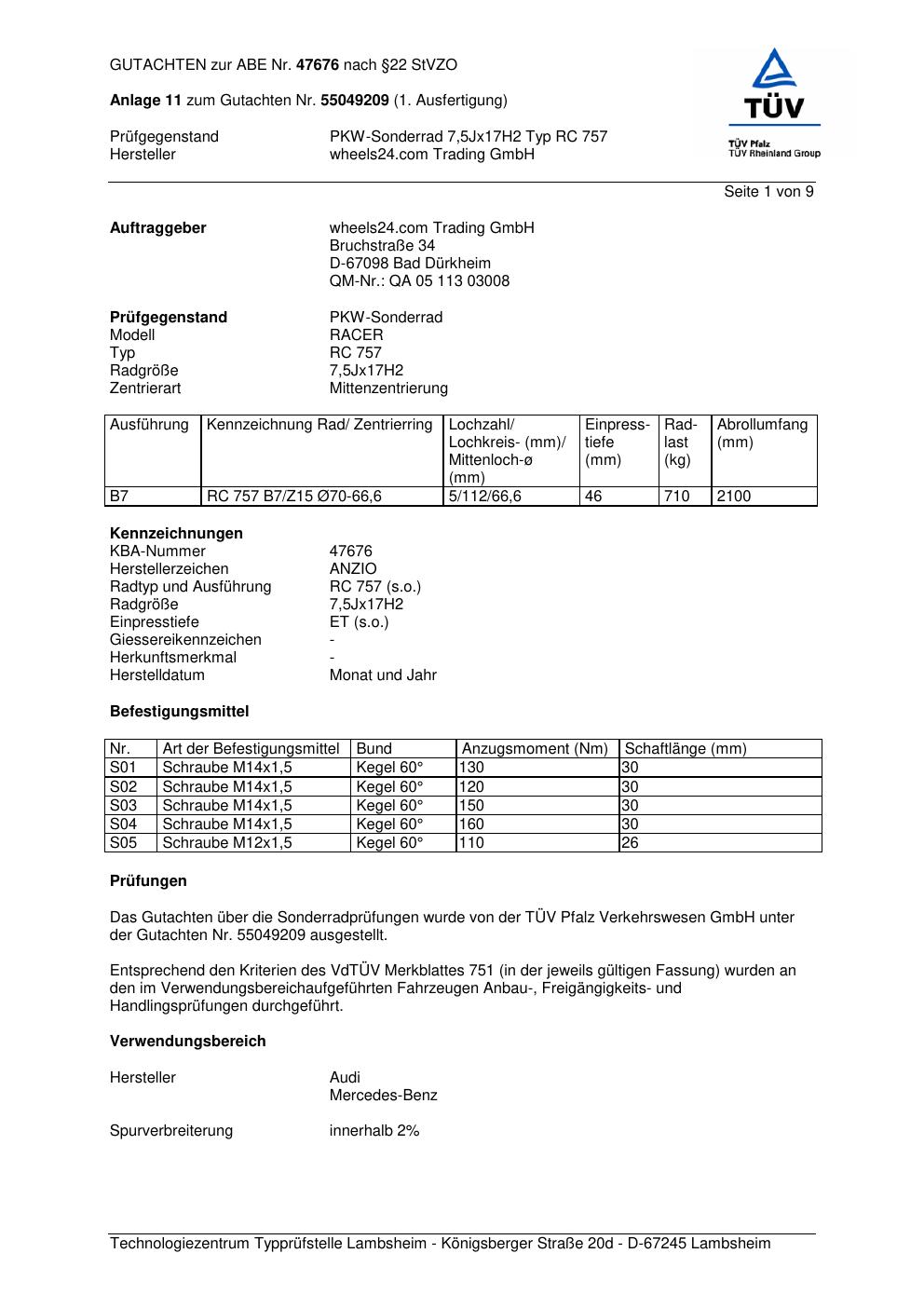 Dieses Gutachten (abe) bezieht sich auf die Alufelge Anzio RC 757 in der Ausführung 7.5Jx17 ET 0, Mittenloch 0 mm (KBA 47676). Im PDF findest du typischerweise zulässige Reifengrößen, Auflagen/Anbauhinweise und – je nach Dokument – Hinweise zur Eintragung.
