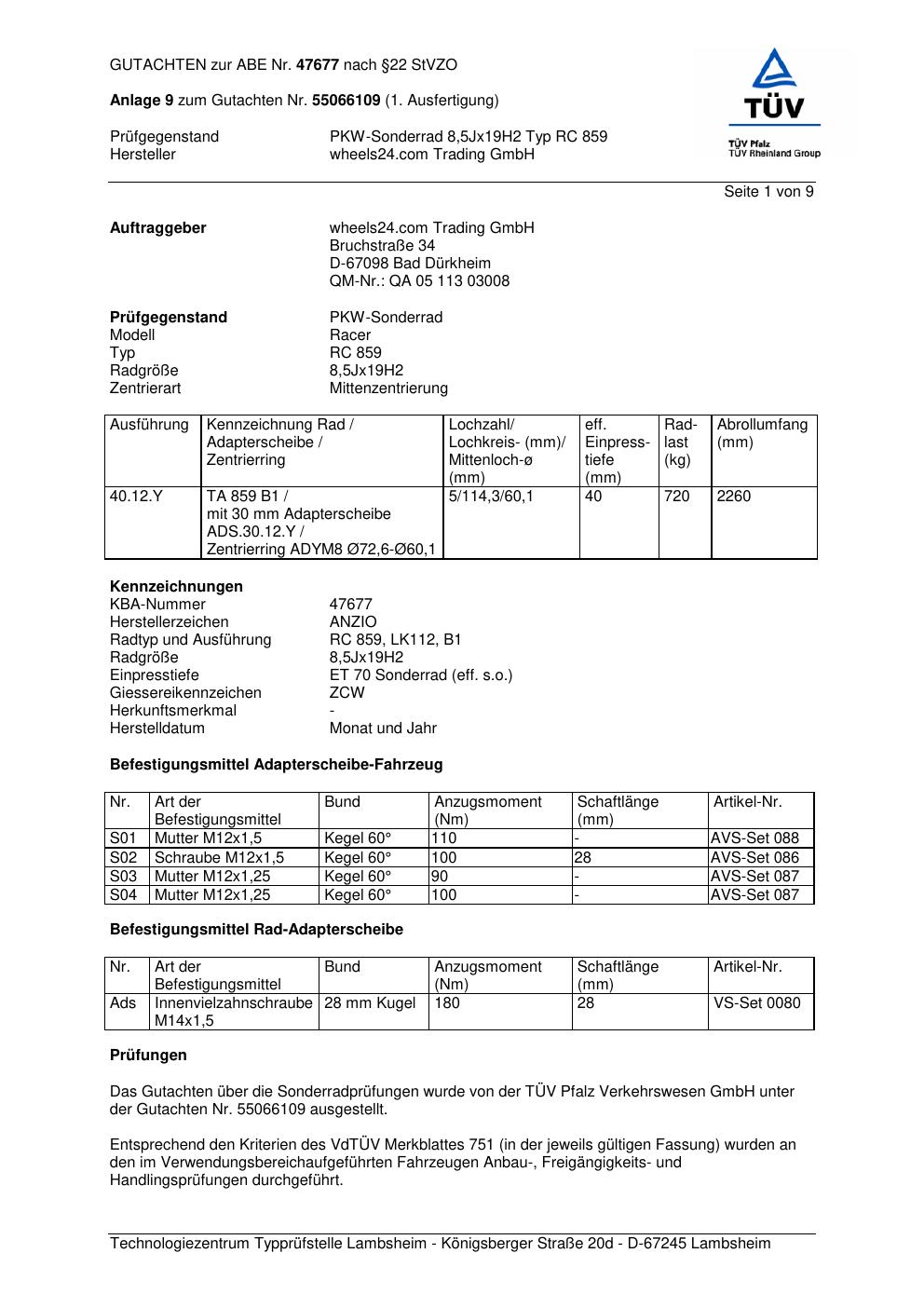 Dieses Gutachten (abe) bezieht sich auf die Alufelge Anzio RC 859 in der Ausführung 8.5Jx19 ET 0, Mittenloch 0 mm (KBA 47677). Im PDF findest du typischerweise zulässige Reifengrößen, Auflagen/Anbauhinweise und – je nach Dokument – Hinweise zur Eintragung.
