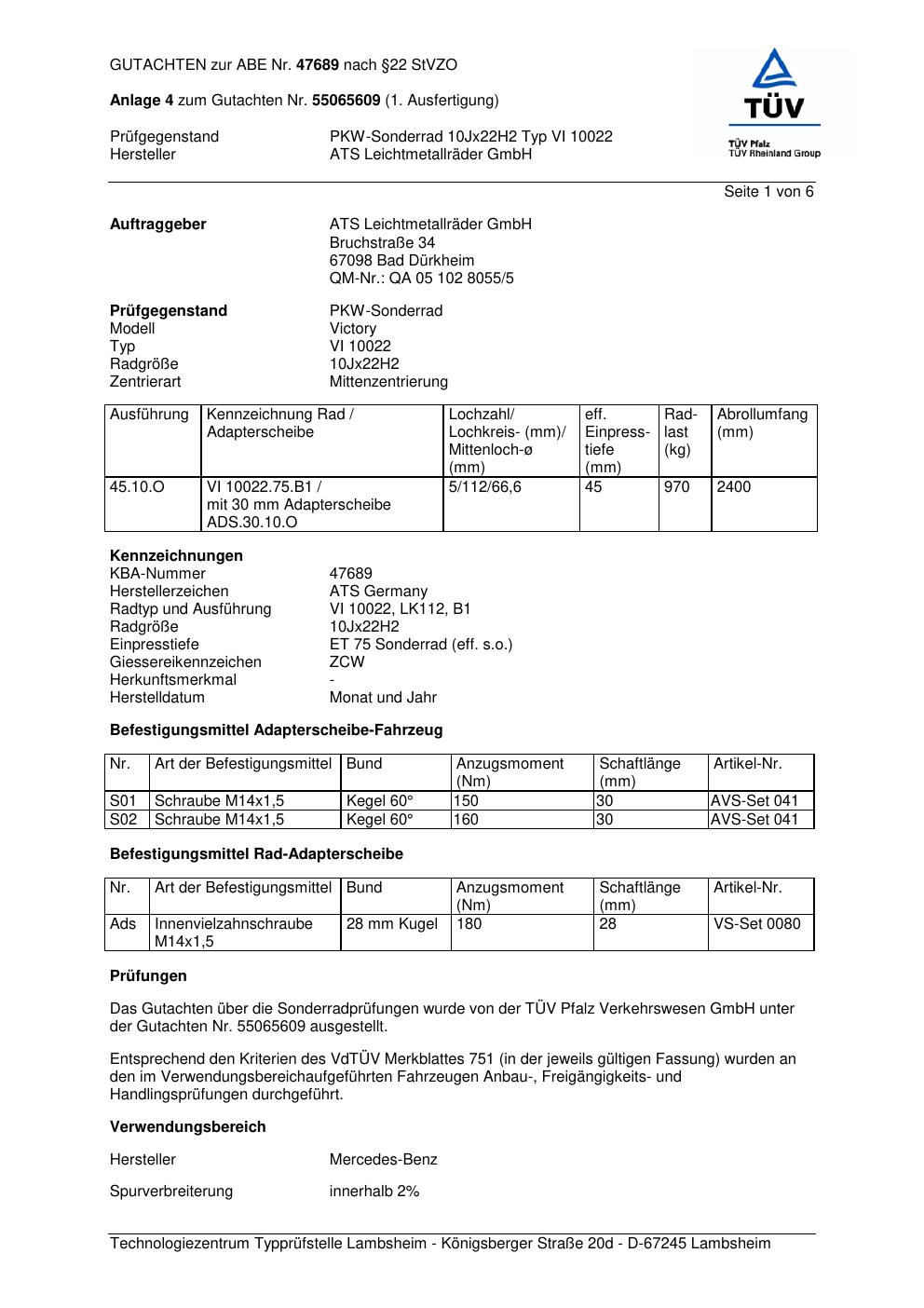 Dieses Gutachten (abe) bezieht sich auf die Alufelge ATS VI 10022 in der Ausführung 10Jx22 ET 0, Mittenloch 0 mm (KBA 47689). Im PDF findest du typischerweise zulässige Reifengrößen, Auflagen/Anbauhinweise und – je nach Dokument – Hinweise zur Eintragung.