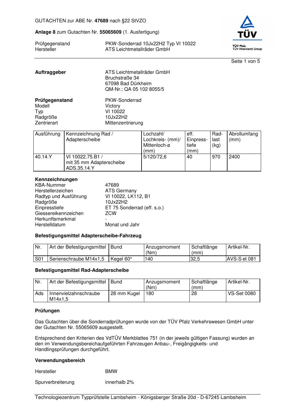 Dieses Gutachten (abe) bezieht sich auf die Alufelge ATS VI 10022 in der Ausführung 10Jx22 ET 0, Mittenloch 0 mm (KBA 47689). Im PDF findest du typischerweise zulässige Reifengrößen, Auflagen/Anbauhinweise und – je nach Dokument – Hinweise zur Eintragung.