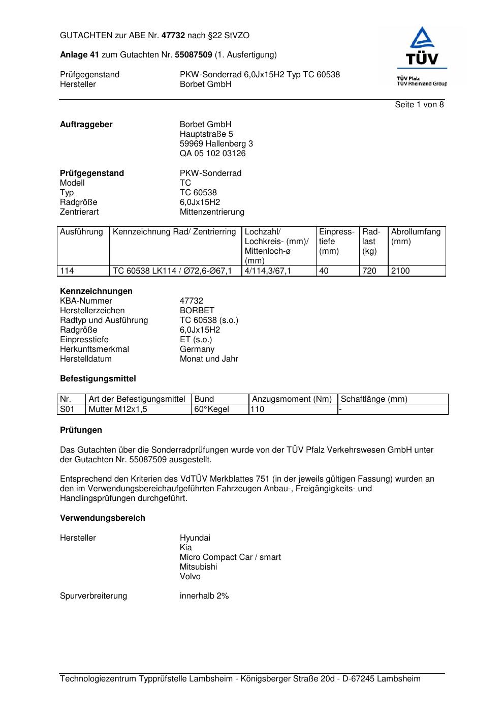 Dieses Gutachten (abe) bezieht sich auf die Alufelge Borbet TC 60538 in der Ausführung 6Jx15 ET 0, Mittenloch 0 mm (KBA 47732). Im PDF findest du typischerweise zulässige Reifengrößen, Auflagen/Anbauhinweise und – je nach Dokument – Hinweise zur Eintragung.