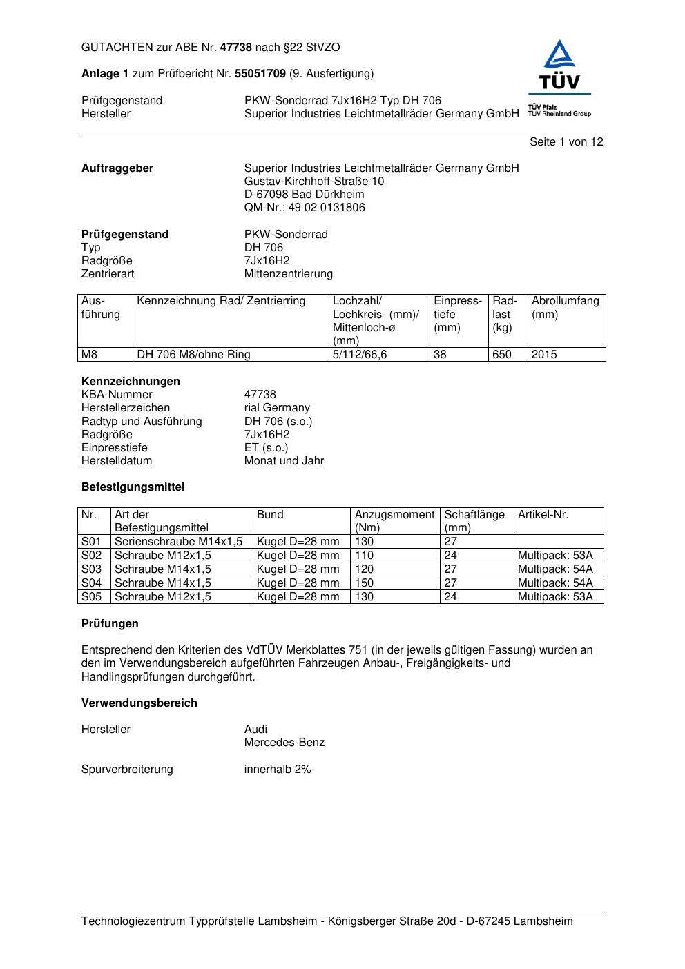 Dieses Gutachten (abe) bezieht sich auf die Alufelge brand-rial DH 706 in der Ausführung 7Jx16 ET 0, Mittenloch 0 mm (KBA 47738). Im PDF findest du typischerweise zulässige Reifengrößen, Auflagen/Anbauhinweise und – je nach Dokument – Hinweise zur Eintragung.