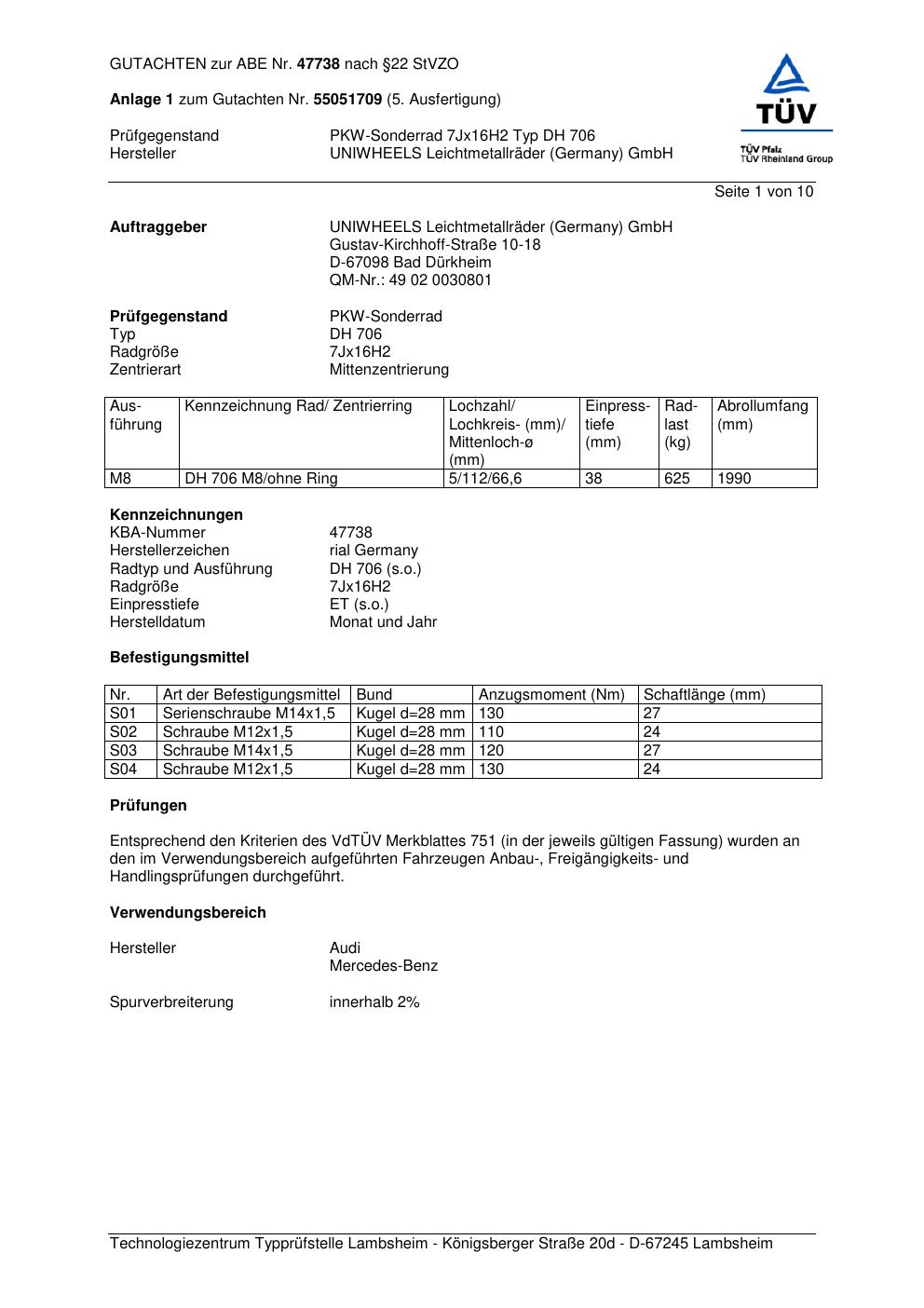 Dieses Gutachten (abe) bezieht sich auf die Alufelge brand-rial DH 706 in der Ausführung 7Jx16 ET 0, Mittenloch 0 mm (KBA 47738). Im PDF findest du typischerweise zulässige Reifengrößen, Auflagen/Anbauhinweise und – je nach Dokument – Hinweise zur Eintragung.