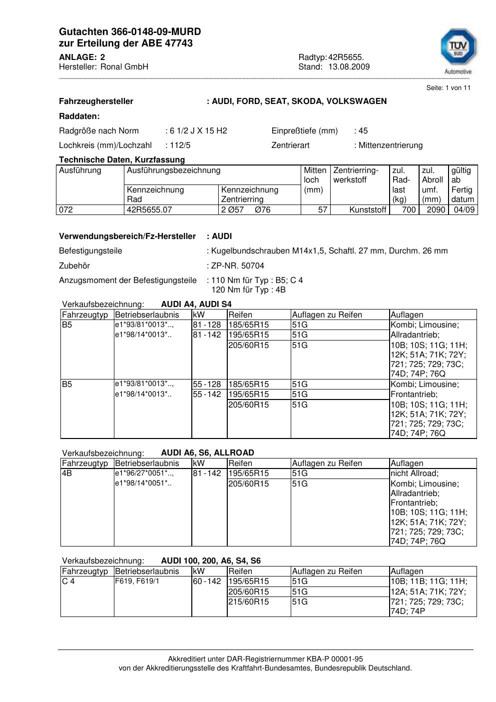 Felgengutachten / abe für Alufelgen Ronal 42R5655 (2Jx15 ET 0, Mittenloch 0 mm) mit KBA 47743 (Zertifikatsnummer 47743). Hier kostenlos als PDF herunterladen. Der Download-Link ist 24 Stunden gültig und kann bis zu zwei Mal verwendet werden.