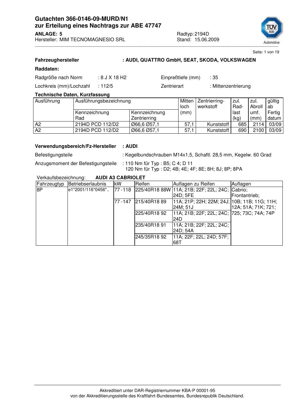 Felgengutachten / abe für Alufelgen ATS 2194D (8Jx18 ET 0, Mittenloch 0 mm) mit KBA 47747 (Zertifikatsnummer 47747). Hier kostenlos als PDF herunterladen. Der Download-Link ist 24 Stunden gültig und kann bis zu zwei Mal verwendet werden.