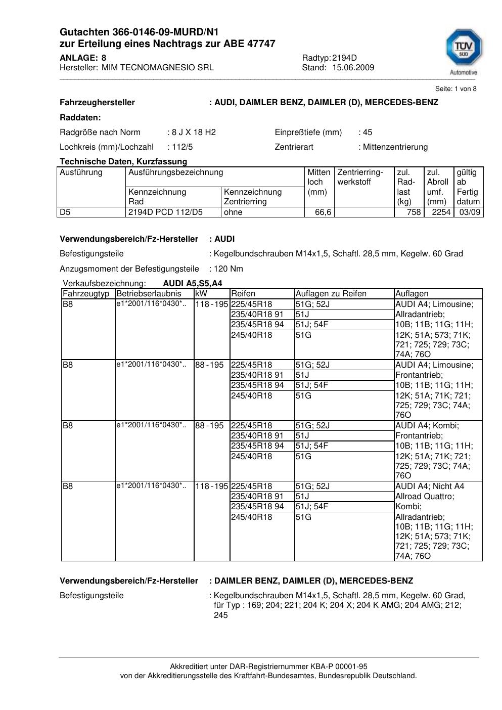 Felgengutachten / abe für Alufelgen ATS 2194D (8Jx18 ET 0, Mittenloch 0 mm) mit KBA 47747 (Zertifikatsnummer 47747). Hier kostenlos als PDF herunterladen. Der Download-Link ist 24 Stunden gültig und kann bis zu zwei Mal verwendet werden.