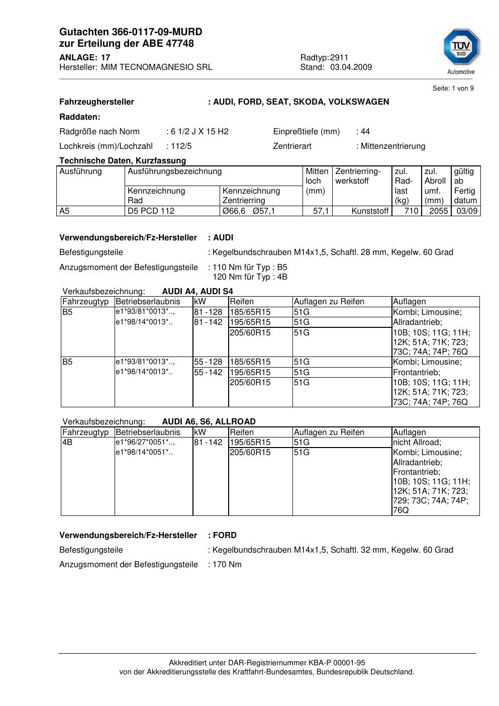 Fahrzeughersteller: AUDI, FORD, SEAT, SKODA, VOLKSWAGEN, VW