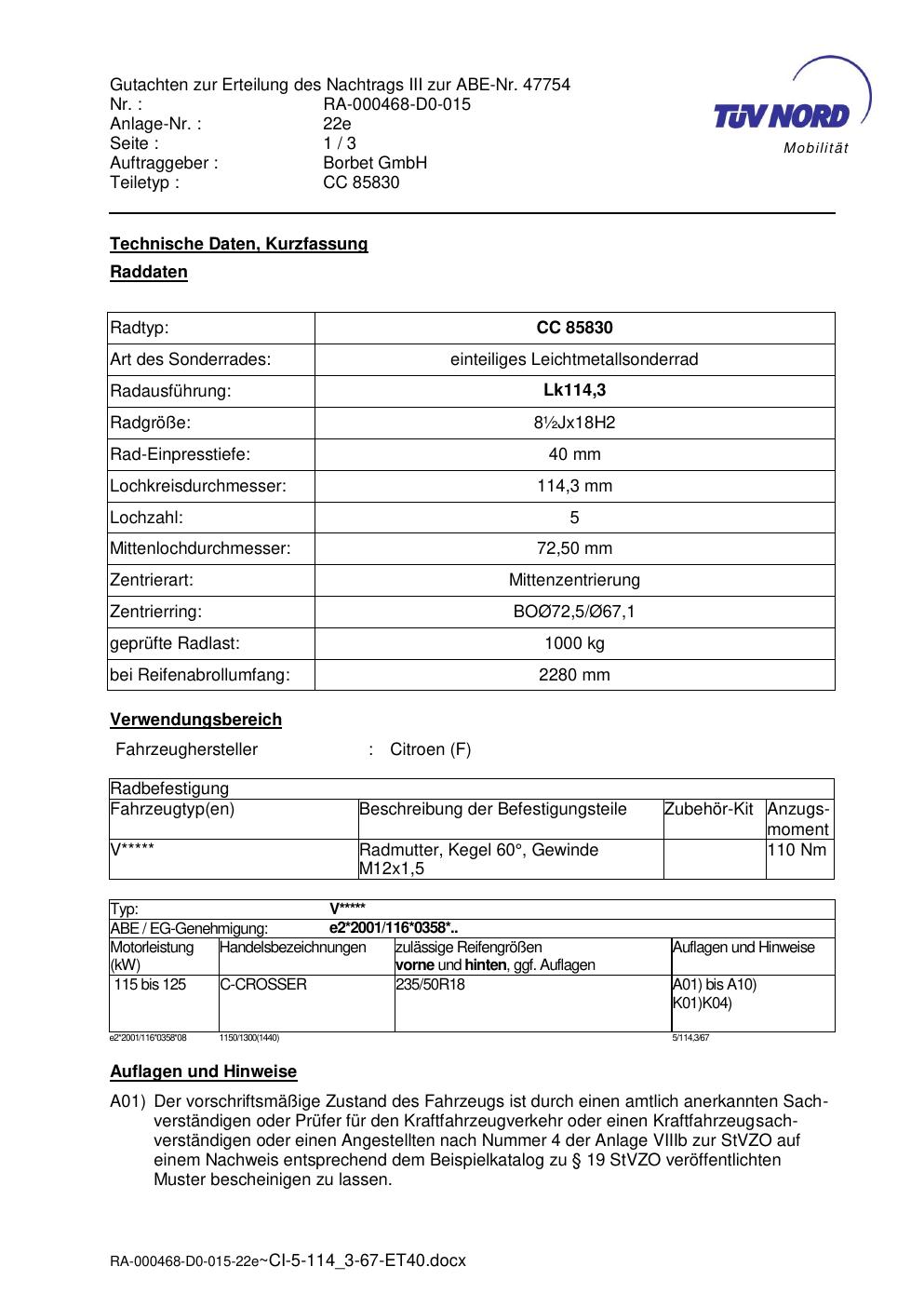 Dieses Gutachten (abe) bezieht sich auf die Alufelge brand-borbet CC 85830 in der Ausführung ET 0, Mittenloch 0 mm (KBA 47754). Im PDF findest du typischerweise zulässige Reifengrößen, Auflagen/Anbauhinweise und – je nach Dokument – Hinweise zur Eintragung.