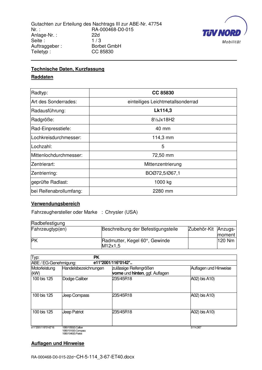 Dieses Gutachten (abe) bezieht sich auf die Alufelge brand-borbet CC 85830 in der Ausführung ET 0, Mittenloch 0 mm (KBA 47754). Im PDF findest du typischerweise zulässige Reifengrößen, Auflagen/Anbauhinweise und – je nach Dokument – Hinweise zur Eintragung.