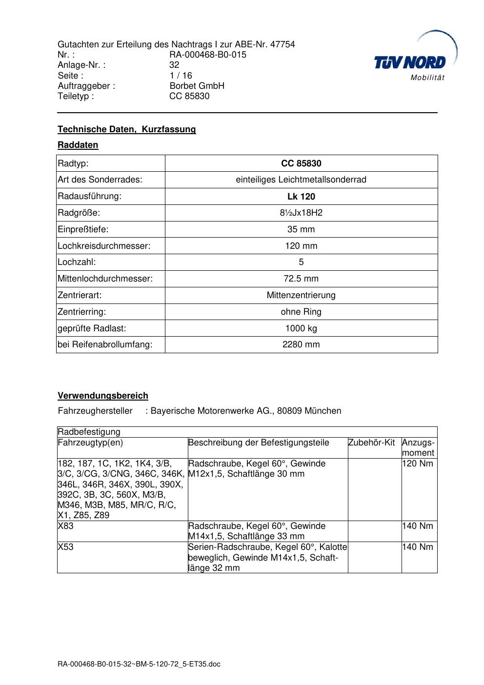 Dieses Gutachten (abe) bezieht sich auf die Alufelge Borbet CC 85830 in der Ausführung ET 0, Mittenloch 0 mm (KBA 47754). Im PDF findest du typischerweise zulässige Reifengrößen, Auflagen/Anbauhinweise und – je nach Dokument – Hinweise zur Eintragung.