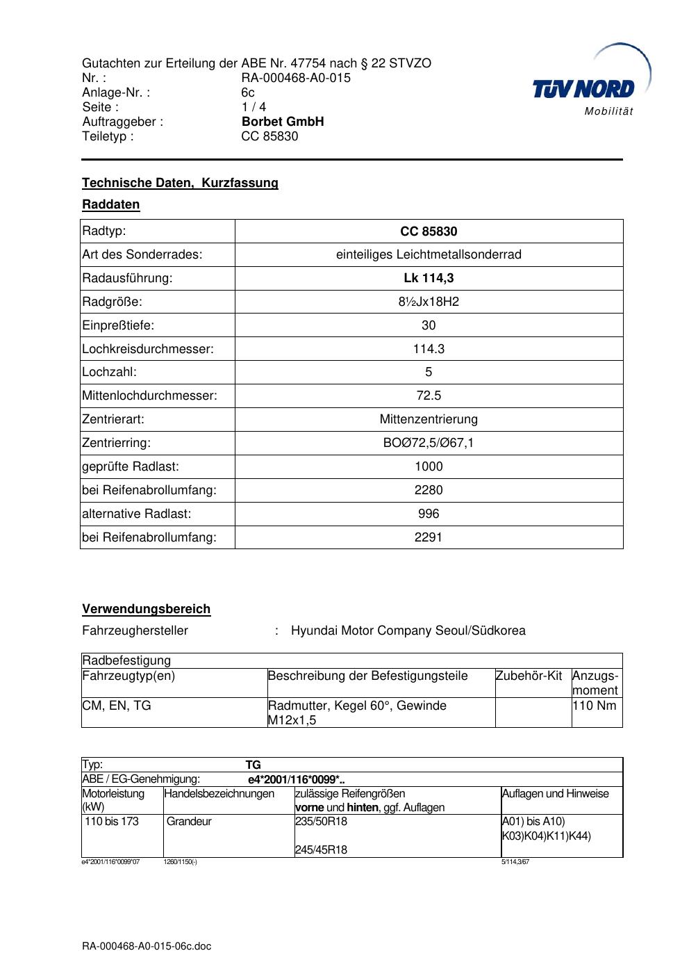 Dieses Gutachten (abe) bezieht sich auf die Alufelge brand-borbet CC 85830 in der Ausführung ET 0, Mittenloch 0 mm (KBA 47754). Im PDF findest du typischerweise zulässige Reifengrößen, Auflagen/Anbauhinweise und – je nach Dokument – Hinweise zur Eintragung.