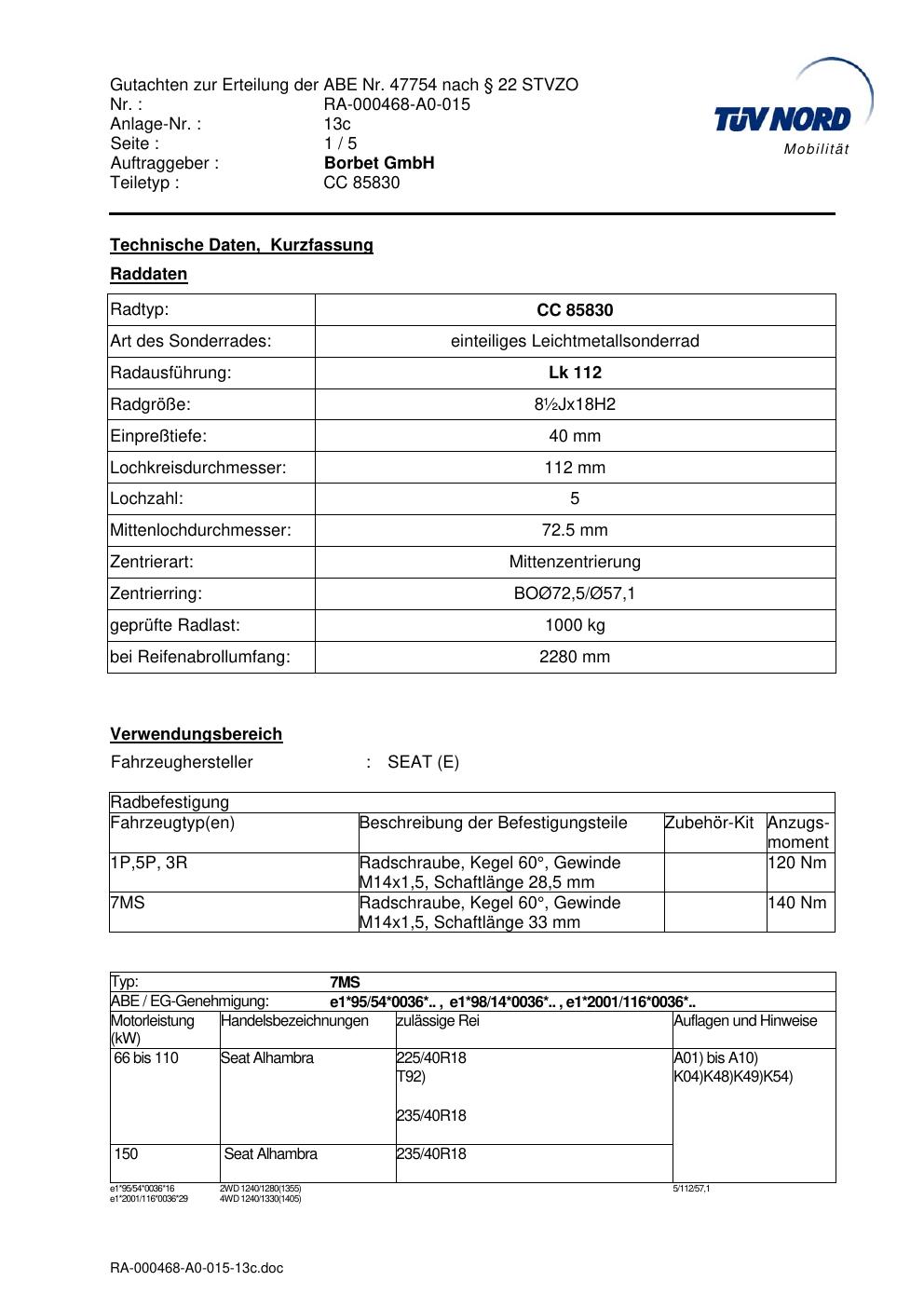 Dieses Gutachten (abe) bezieht sich auf die Alufelge brand-borbet CC 85830 in der Ausführung ET 0, Mittenloch 0 mm (KBA 47754). Im PDF findest du typischerweise zulässige Reifengrößen, Auflagen/Anbauhinweise und – je nach Dokument – Hinweise zur Eintragung.