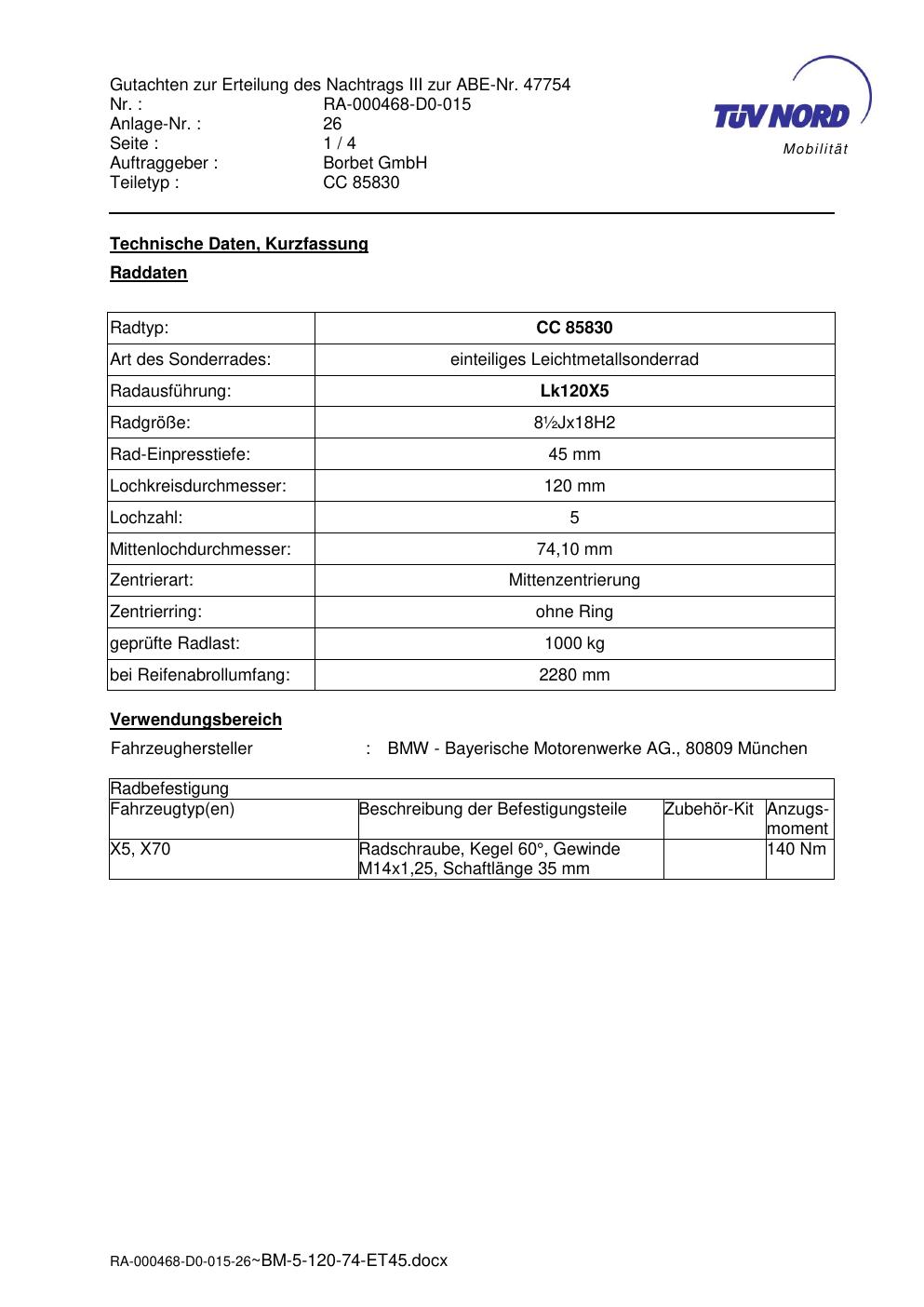 Dieses Gutachten (abe) bezieht sich auf die Alufelge brand-borbet CC 85830 in der Ausführung ET 0, Mittenloch 0 mm (KBA 47754). Im PDF findest du typischerweise zulässige Reifengrößen, Auflagen/Anbauhinweise und – je nach Dokument – Hinweise zur Eintragung.