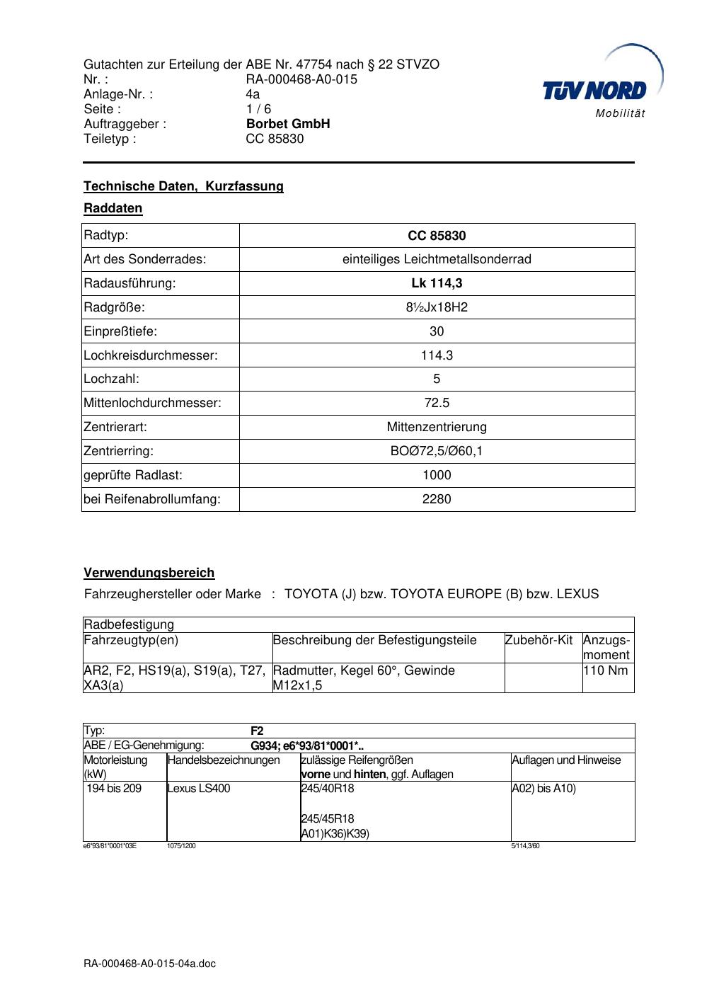 Dieses Gutachten (abe) bezieht sich auf die Alufelge brand-borbet CC 85830 in der Ausführung ET 0, Mittenloch 0 mm (KBA 47754). Im PDF findest du typischerweise zulässige Reifengrößen, Auflagen/Anbauhinweise und – je nach Dokument – Hinweise zur Eintragung.