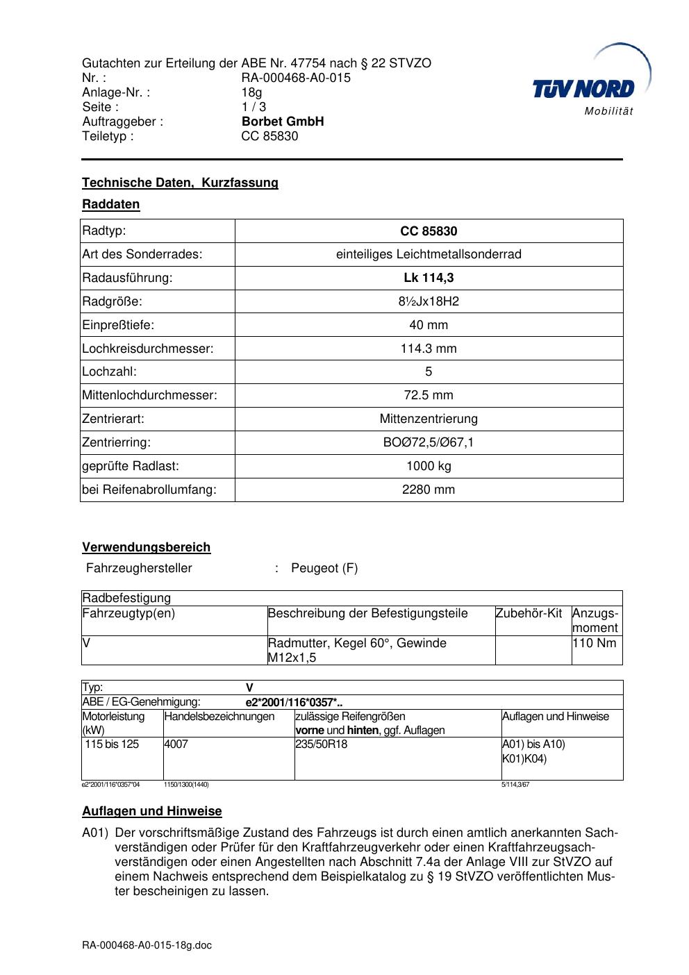 Dieses Gutachten (abe) bezieht sich auf die Alufelge brand-borbet CC 85830 in der Ausführung ET 0, Mittenloch 0 mm (KBA 47754). Im PDF findest du typischerweise zulässige Reifengrößen, Auflagen/Anbauhinweise und – je nach Dokument – Hinweise zur Eintragung.
