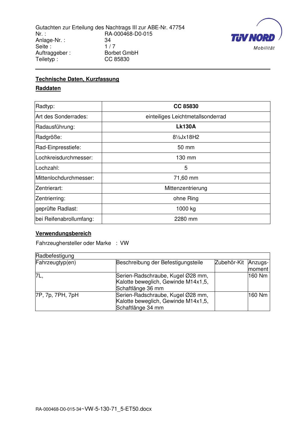 Dieses Gutachten (abe) bezieht sich auf die Alufelge brand-borbet CC 85830 in der Ausführung ET 0, Mittenloch 0 mm (KBA 47754). Im PDF findest du typischerweise zulässige Reifengrößen, Auflagen/Anbauhinweise und – je nach Dokument – Hinweise zur Eintragung.