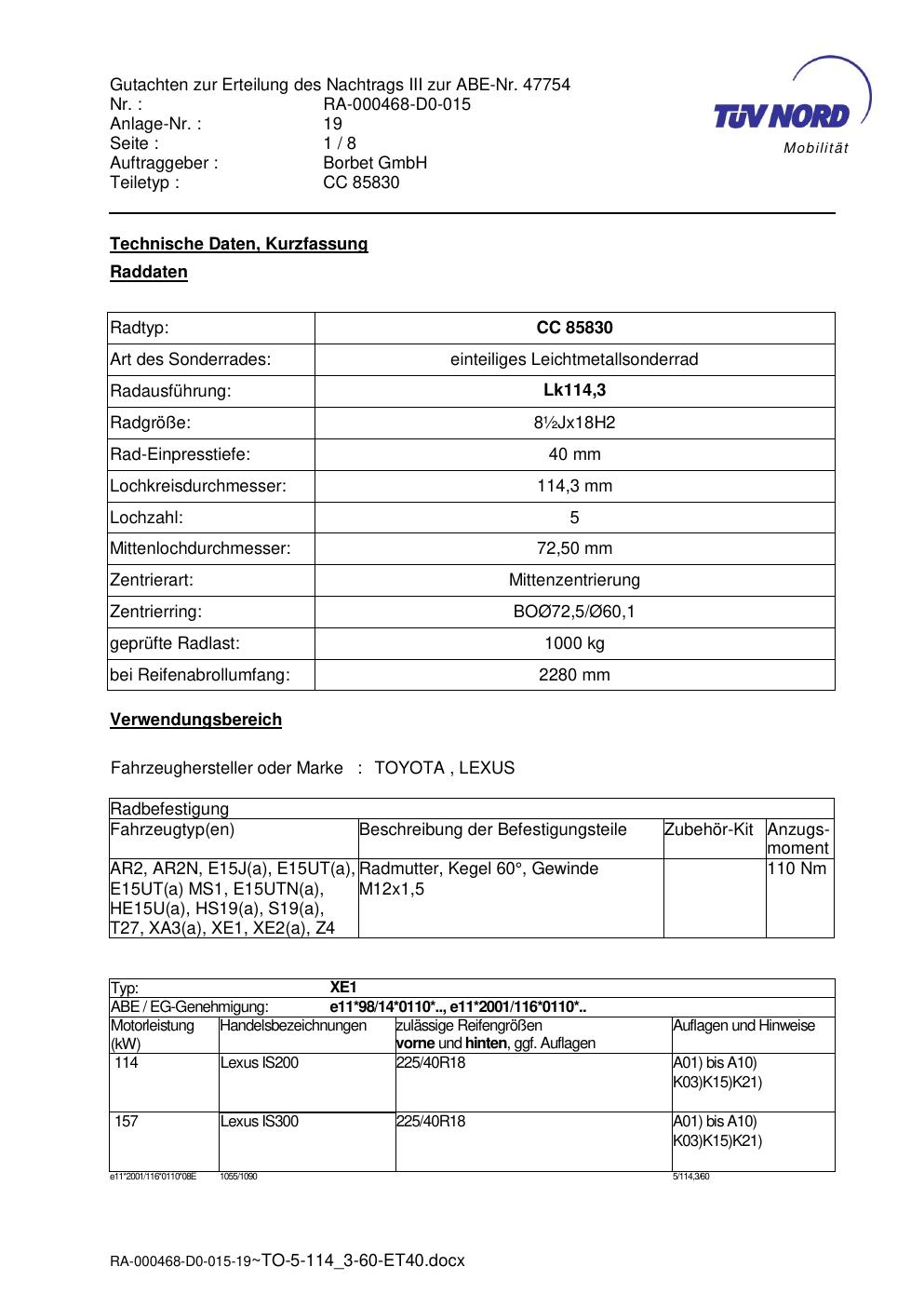 Dieses Gutachten (abe) bezieht sich auf die Alufelge brand-borbet CC 85830 in der Ausführung ET 0, Mittenloch 0 mm (KBA 47754). Im PDF findest du typischerweise zulässige Reifengrößen, Auflagen/Anbauhinweise und – je nach Dokument – Hinweise zur Eintragung.