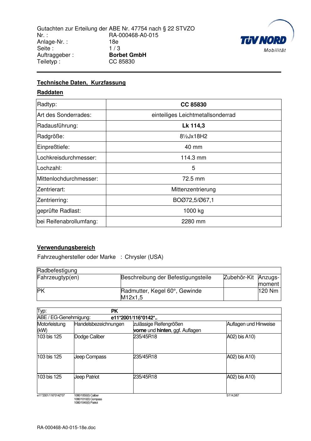 Dieses Gutachten (abe) bezieht sich auf die Alufelge brand-borbet CC 85830 in der Ausführung ET 0, Mittenloch 0 mm (KBA 47754). Im PDF findest du typischerweise zulässige Reifengrößen, Auflagen/Anbauhinweise und – je nach Dokument – Hinweise zur Eintragung.