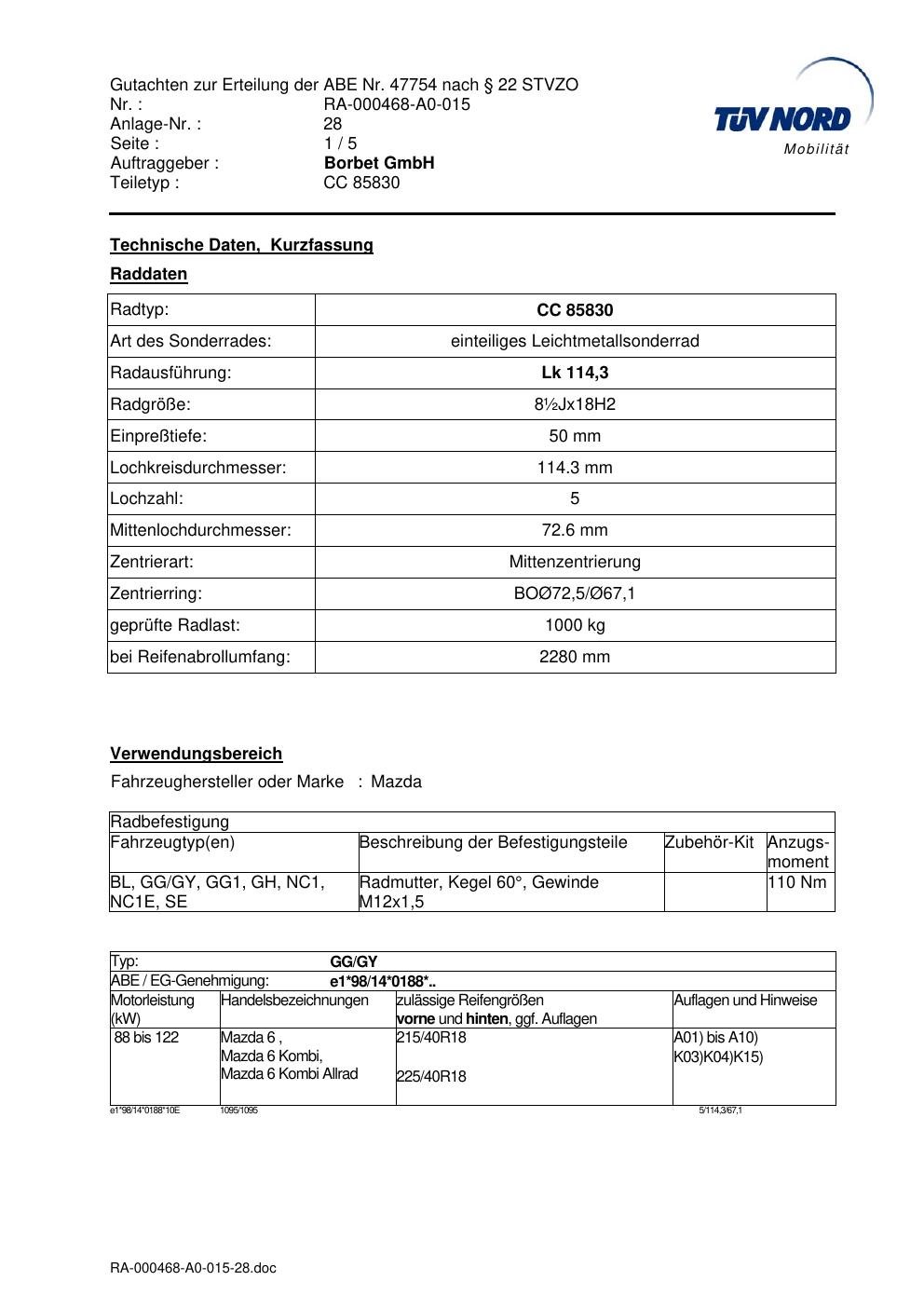 Dieses Gutachten (abe) bezieht sich auf die Alufelge brand-borbet CC 85830 in der Ausführung ET 0, Mittenloch 0 mm (KBA 47754). Im PDF findest du typischerweise zulässige Reifengrößen, Auflagen/Anbauhinweise und – je nach Dokument – Hinweise zur Eintragung.