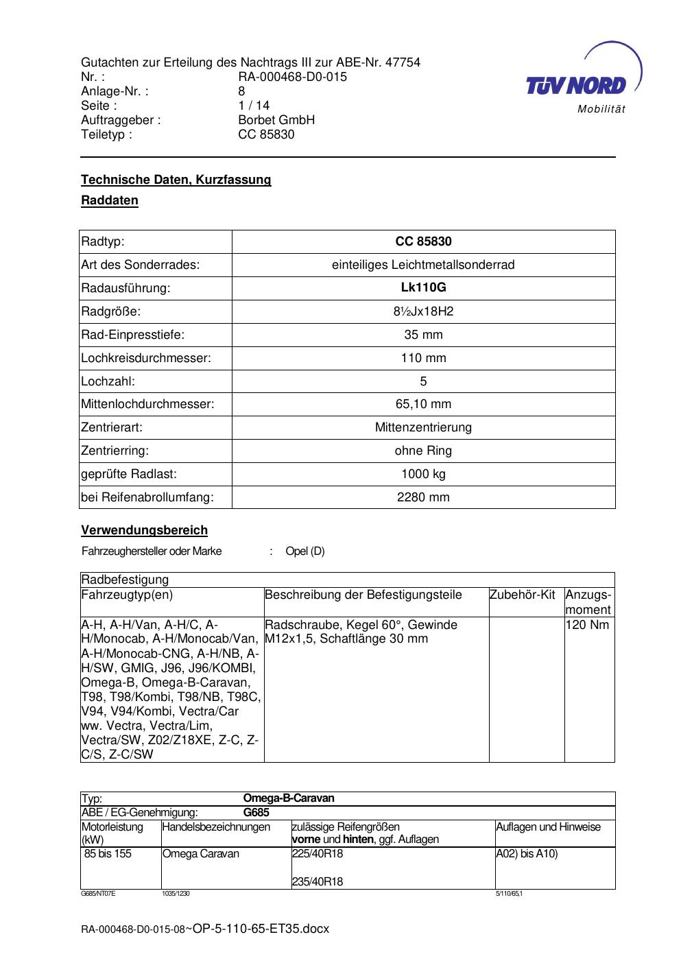 Dieses Gutachten (abe) bezieht sich auf die Alufelge brand-borbet CC 85830 in der Ausführung ET 0, Mittenloch 0 mm (KBA 47754). Im PDF findest du typischerweise zulässige Reifengrößen, Auflagen/Anbauhinweise und – je nach Dokument – Hinweise zur Eintragung.