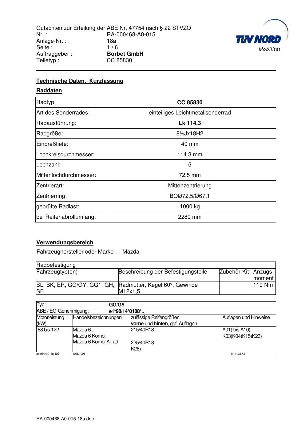 Dieses Gutachten (abe) bezieht sich auf die Alufelge brand-borbet CC 85830 in der Ausführung ET 0, Mittenloch 0 mm (KBA 47754). Im PDF findest du typischerweise zulässige Reifengrößen, Auflagen/Anbauhinweise und – je nach Dokument – Hinweise zur Eintragung.