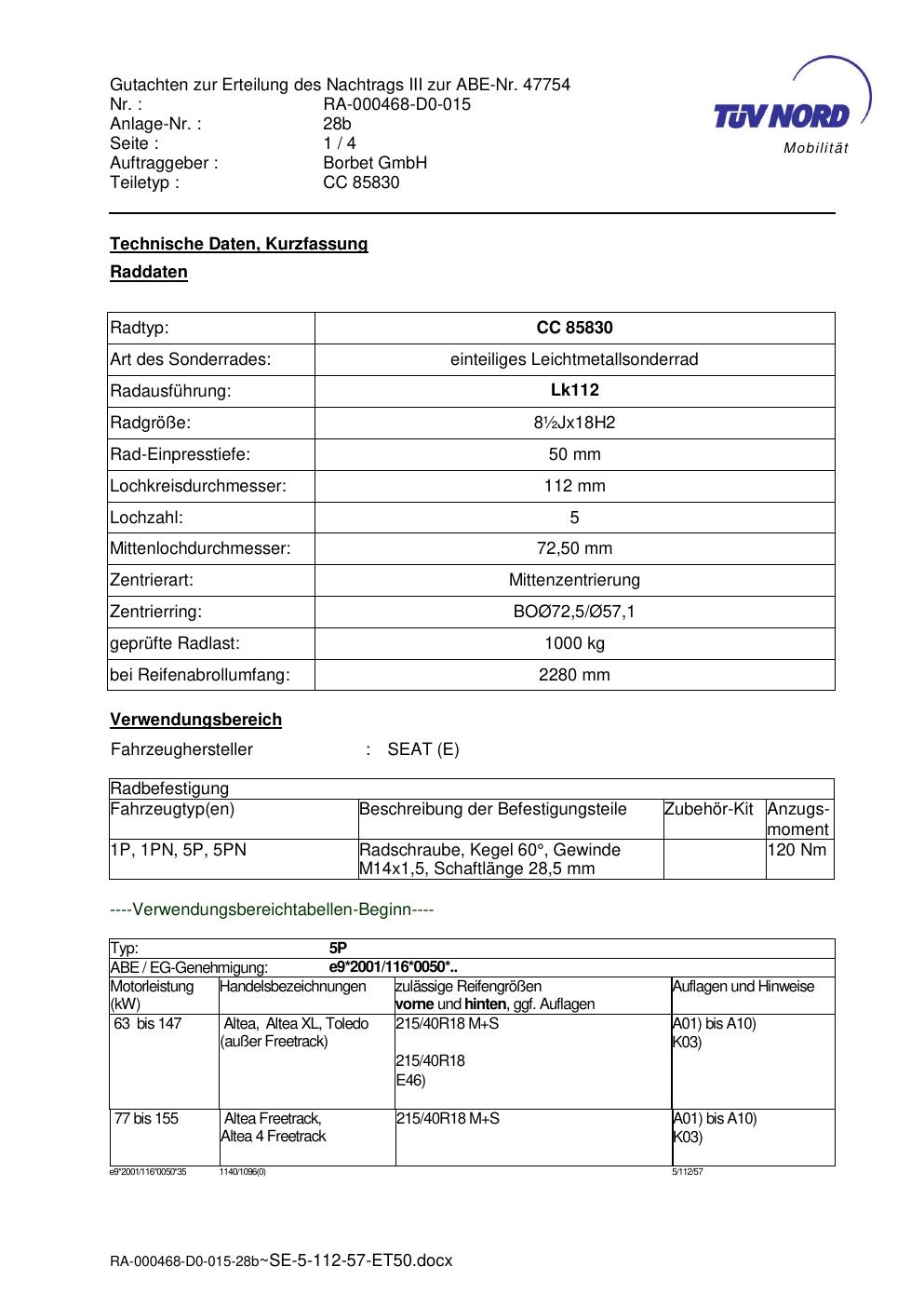 Dieses Gutachten (abe) bezieht sich auf die Alufelge brand-borbet CC 85830 in der Ausführung ET 0, Mittenloch 0 mm (KBA 47754). Im PDF findest du typischerweise zulässige Reifengrößen, Auflagen/Anbauhinweise und – je nach Dokument – Hinweise zur Eintragung.