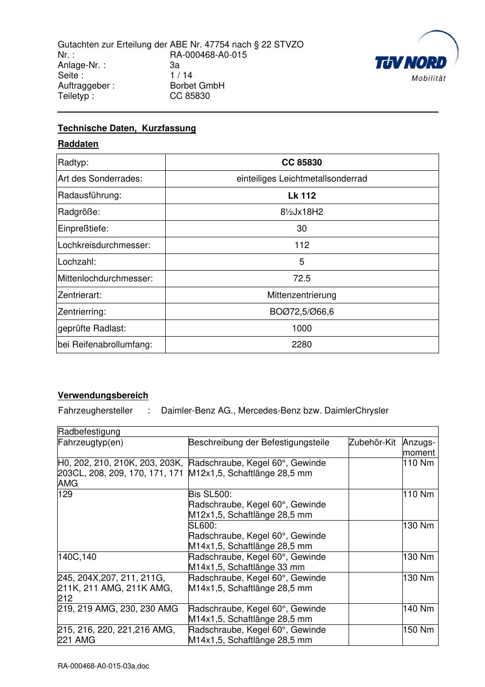 Dieses Gutachten (abe) bezieht sich auf die Alufelge brand-borbet CC 85830 in der Ausführung ET 0, Mittenloch 0 mm (KBA 47754). Im PDF findest du typischerweise zulässige Reifengrößen, Auflagen/Anbauhinweise und – je nach Dokument – Hinweise zur Eintragung.