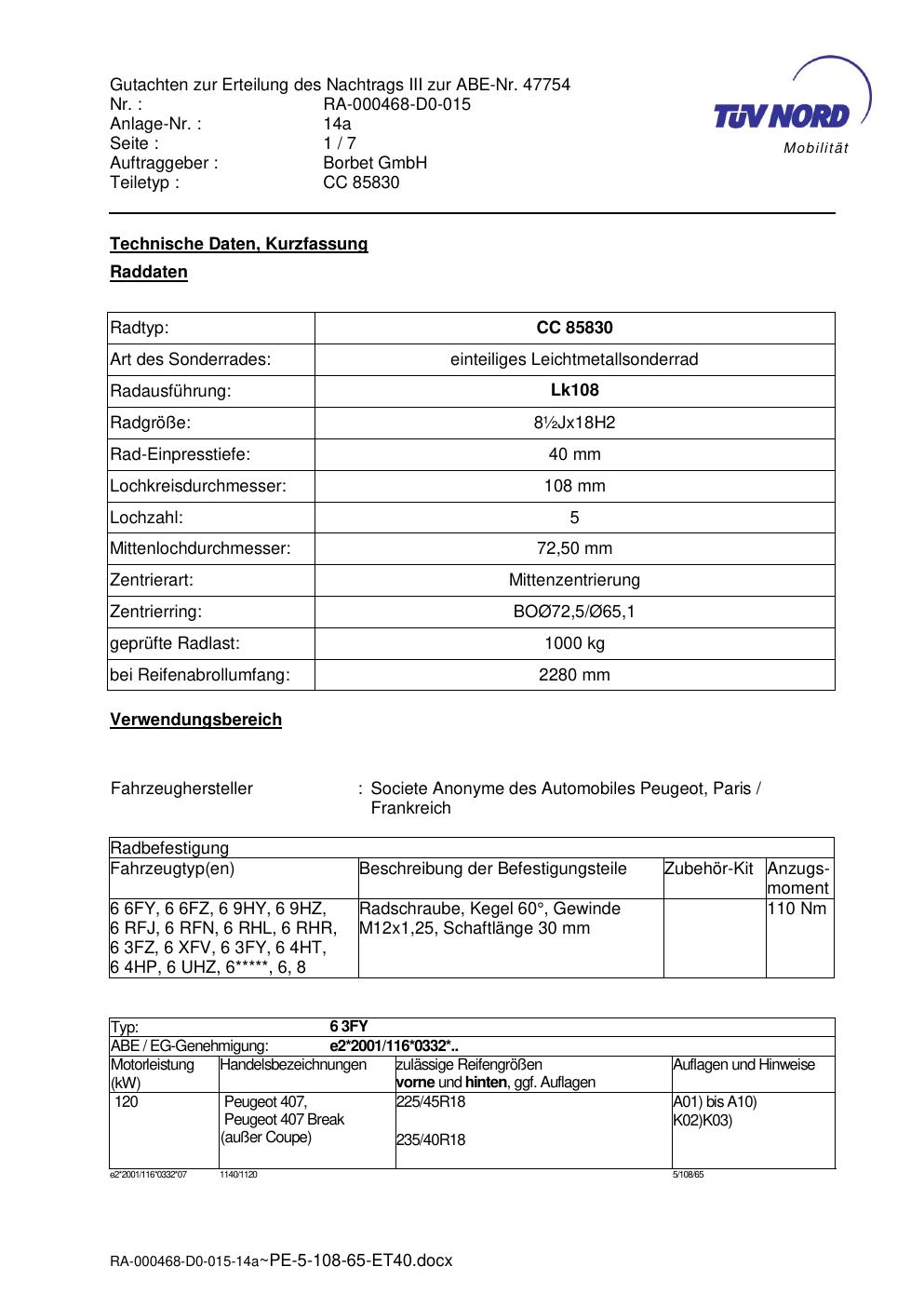 Dieses Gutachten (abe) bezieht sich auf die Alufelge brand-borbet CC 85830 in der Ausführung ET 0, Mittenloch 0 mm (KBA 47754). Im PDF findest du typischerweise zulässige Reifengrößen, Auflagen/Anbauhinweise und – je nach Dokument – Hinweise zur Eintragung.