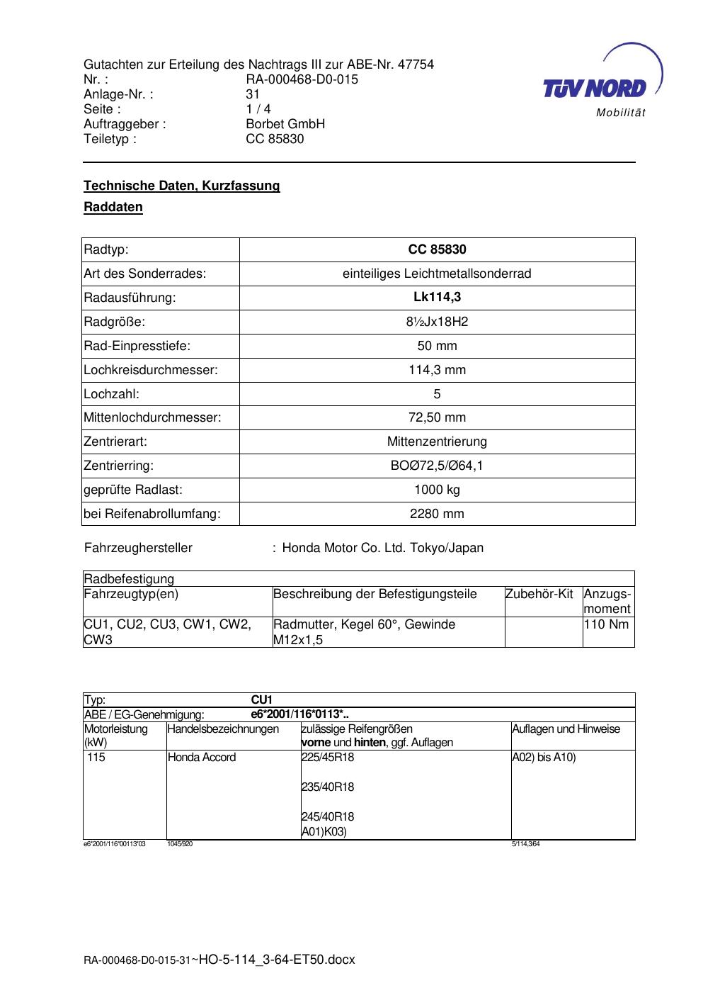 Dieses Gutachten (abe) bezieht sich auf die Alufelge brand-borbet CC 85830 in der Ausführung ET 0, Mittenloch 0 mm (KBA 47754). Im PDF findest du typischerweise zulässige Reifengrößen, Auflagen/Anbauhinweise und – je nach Dokument – Hinweise zur Eintragung.