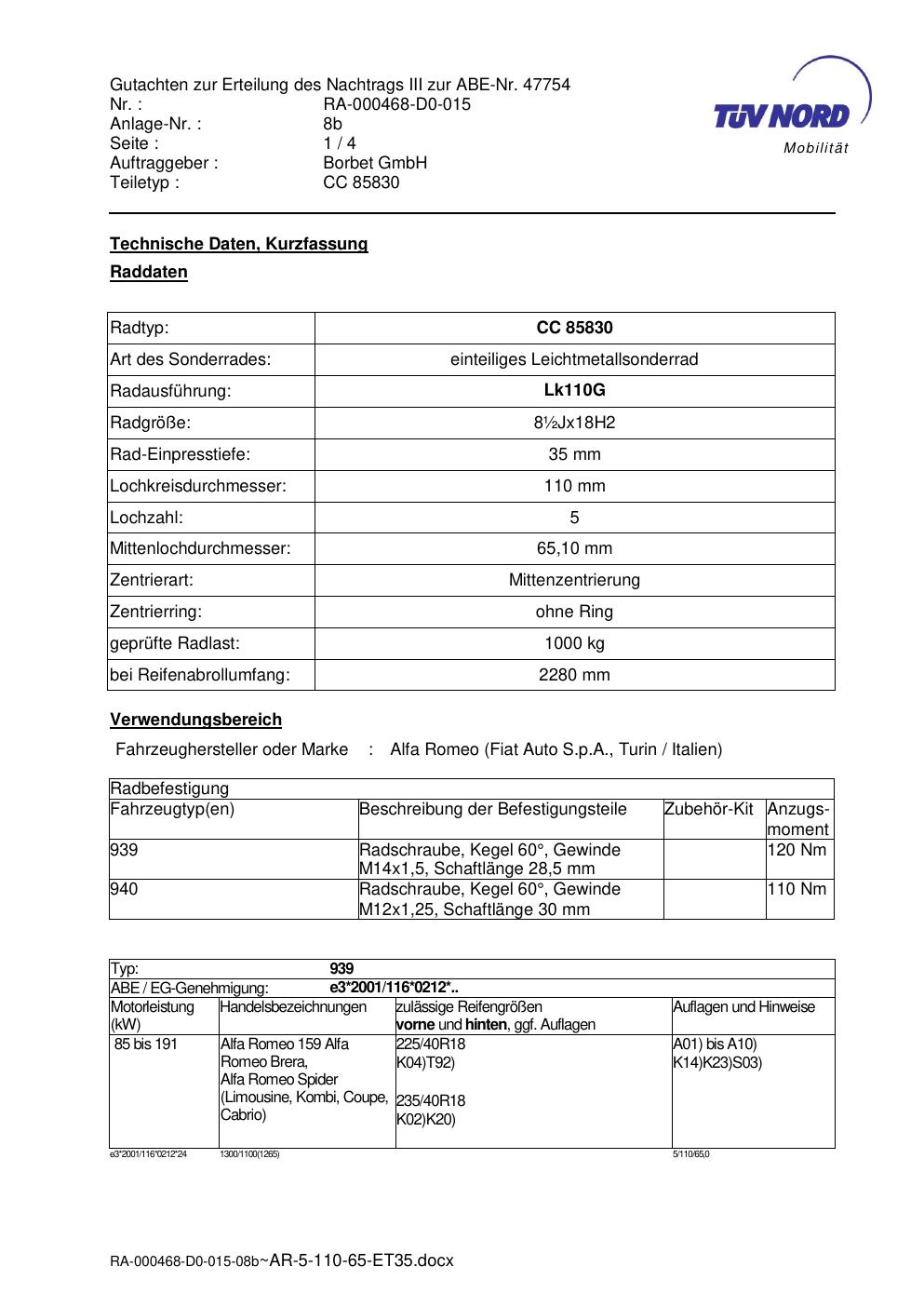 Dieses Gutachten (abe) bezieht sich auf die Alufelge brand-borbet CC 85830 in der Ausführung ET 0, Mittenloch 0 mm (KBA 47754). Im PDF findest du typischerweise zulässige Reifengrößen, Auflagen/Anbauhinweise und – je nach Dokument – Hinweise zur Eintragung.